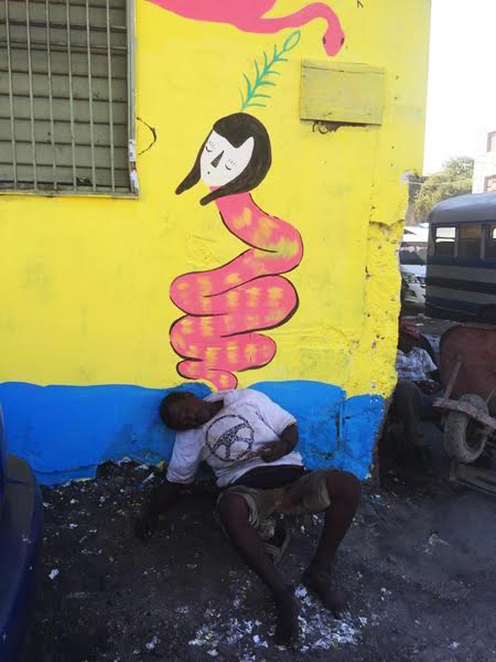 The tire cut-outs made by many of the younger artists in the Grand Rue neighbourhood have been hanging along the cinderblock walls of the alleyways since the first Ghetto Biennale in 2009 and these creatures have grown to be as varied and complex as the artists who make them. What if one night these creatures became possessed and climbed down from the walls after everyone in the ghetto went to sleep? What would these rubbery, recycled spirits have to say about the people who walk through the alleys each day? Would the ancient Egyptian pharaoh and the two-headed Damballah have a heated discussion about the most recent soccer match? Would Barack Obama offer the Medusa/Lasiren a sip of kleren and ask her to dance?